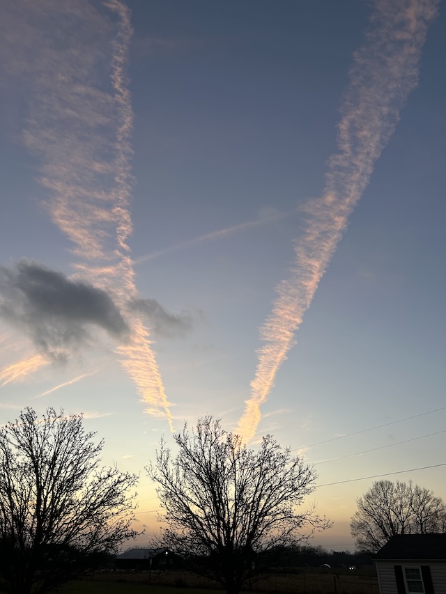 Contrails over eastern Adair County, lit by the evening sun on Tuesday, January 6, 2026.