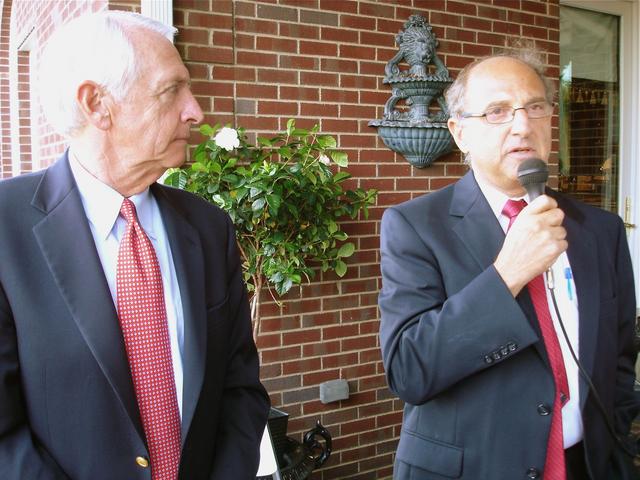 Larry Smith, Operations Manager for Shoreline Communications The Big Dawg radio station FM 99.9 writes, "Governor Steve Beshear listens as famed and feared attorney Elmer George of Lebanon, KY, spoke on his behalf at a get together at the home of Dr. James Angell on KY 49 East of Lebanon, KY. The Governor also spoke, as did the host. Supporters from several nearby counties were in attendance, including Attorney Judy Vance of Columbia, KY; Mayor Lisle Cheatham of Greensburg, KY, and Judge Eddie Rogers of Taylor County. Entertainment was by the Campbellsville University's symphony group. The group enjoyed good political fellowship, and a dinner, served in the beautiful fall like night air, of Grilled Chicken, Penn's Country Ham, Special Dinner Rolls, Green Beans, Corn, Potatoes, and salads - and other fine Kentucky produced products. A good time was had by all." -Larry Smith