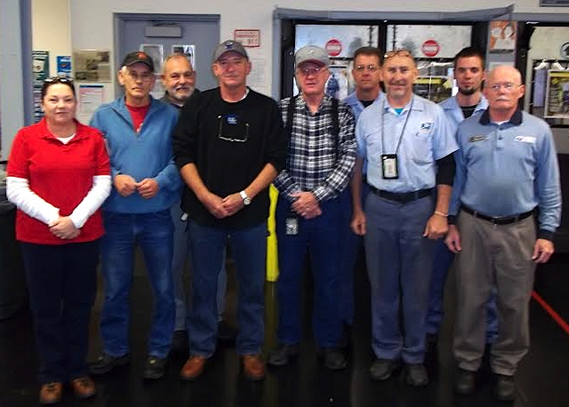 Veterans recognized. -The Columbia Post Office recognized employees today, Friday, 7 November 2014, who have served our country in the Armed Forces. Each was recognized and given a pin to show our appreciation for their service. From left: Cindy Creighton, Data Collection Tech from Bowling Green, Darrell Coomer, Contract Delivery Service Carrier, Ken Lefaivre, Supervisor, Dennis Reeves, Custodian, Ralph Mings, Rural Carrier Associate and Retired KY State Trooper, Ronnie Holt, City Carrier, Joey Topping, City Carrier, Kristopher Knight, City Carrier Assistant, Bernard Dunn, Sales and Service Associate. Not pictured is Robert Hutcheson, Rural Carrier.