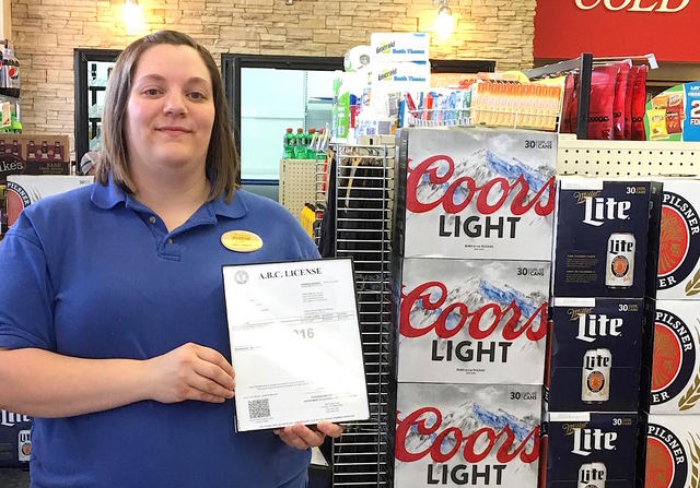 Lori Gabbert, manager of Five Star #2250, was preparing to put the last requirement in place at the convenience store in Holladay Place, immediately prior to opening Malt Beverage sales to customers at the store. At the time, only products from Smith Bros. Beverages of Bardstown were available for sale. the Beer Cave was being stocked. Sales began here and at the Hudson Street Store at around 9amCT. Cases of Coors and Budweiser were on display behind the store manager. - EW