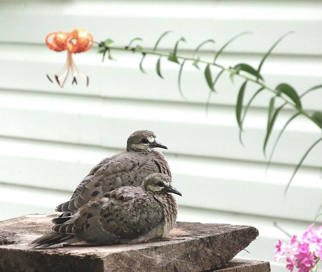 2016-07-18 - Cane Valley, Adair County, KY - Photo by Robert Ellis. The beautiful pair of young doves first on CM on July 13, 2016, are still hanging out at Robert Ellis' shop in Cane Valley, posing, as they wish, for delightful photos like this one, artfully positioning themselves beneath an old fashion Tiger Lily. - CM. Paired photos for today's young dove photos. See: Birds of KY - Doves still hanging out at Robert Ellis shop - I