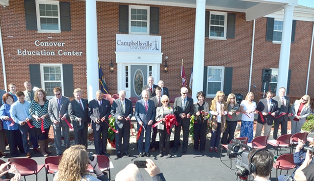 United States Sen. Mitch McConnell (R-KY), center, helps cut the ribbon for the dedication of the Conover Education Center. Members of the Harrodsburg Chamber and the community helped with the ribbon cutting.