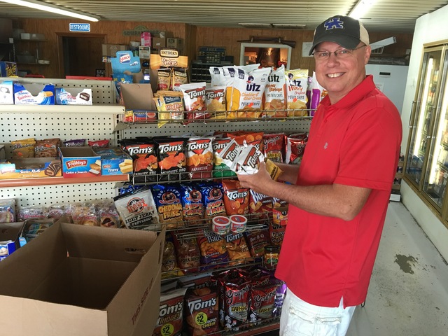 Tim Royse has been in the snack distribution business almost half a century, if one counts the time from when he was a six year old "helping" his father, Dan Royse take Gordon's Potato Chips to stores in this area. He's seen a lot of changes over the years, but basically, it's the same personal relationship enterprise it was in his father's day. His company, Royse Vending, has a warehouse in Columbia and covers Adair and some or all of neighboring Casey, Cumberland, Green, Metcalfe, Russell and Taylor Counties. The photo above was taken on Monday, May 15, 2017, when he was re-stocking his shelf space in the very busy Breeding Country Mart. - EW