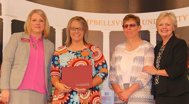 Kentucky Christian Academy’s Jerri Byrd, preschool teacher, was honored at CU’s Excellence in Teaching ceremony. From left are: Dr. Donna Hedgepath, vice president for academic affairs; Jerri Byrd, Kentucky Christian Academy; Lori Eubank, administrator; and Dr. Beverly Ennis, dean of the Campbellsville University School of Education. Byrd is a preschool teacher at Kentucky Christian Academy, where she has worked since 2014. She graduated in 2001 from Taylor County High School. In 2003, Byrd obtained her Associate in Early Childhood Education from Lindsey Wilson College. She is married to Donnie R. Byrd, and they have two children, Abigail and Molly.