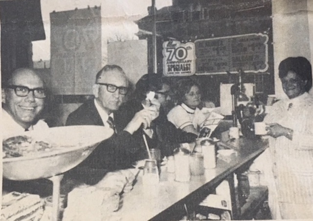 Mike writes, "Coffee Day in Columbia, 6 February 1973, Daily Statesman: At the lunch counter of Young & Wilson Drug, Public Square in Columbia. J.C. Marshall, Dallas Stotts, Earl Huddleston, Janet Withers and Eva Ray Roy."