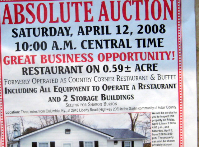 (ADV) What's for breakfast in Adair Co., KY, Thurs, April 10, 2008 Open after midnight every night until 2 o'clock in the afternoon. DONUT EXPRESS - DONUTS ARE READY NOW! 605 Fairground Street, Columbia, KY 42728. Nick Warmouth, owner, operator. Call: (270) 384-8903 for carryouts or to expedite your order. TODAY: Take a dozen or two for the weekend today! ($4.98/dozen=41.5 cents each, by the dozen!) MENU. Delicious Fresh Baked, Donuts Baked every day right here in Columbia. Glazed, cake, jelly-filled, plain, fancy and more! People drive from miles around to get them. Fresh brewed hot coffee, hot breakfast biscuit sandwiches. Open at 5:00amCT: Serving Breakfast anytime. BOB'S COUNTY KITCHEN & GENERAL STORE, 5097 Liberty Rd, Columbia, KY, Vester Community, Phone (270) 384-6774. MENU Hours: 5:00am-8:00pm, Mon. through Sat. Sunday, 8:00am-5pmCT. Breakfast anytime!(with Pie!) anytime. 40cent bottomless cup of coffee! _____Omelet_____3.75 RESTAURANT OPPORTUNITY! (ADV) BURTON REAL ESTATE & AUCTION SERVICE opportunity of a lifetime, Auction, County Corner Restaurant & Buffet, Garlin, KY, at 10:00amCT, Saturday, August 12, 2008. See See Handbill (ADV) 2008-04-09 23:05:54 | Comments | Printable version