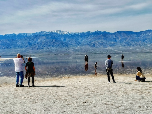 Robert writes, "Closer up scene of folks posing for photo opps, and kids (as well as grownups) just having fun playing in the salty, shallow water in Death Valley National Park. The dry land appears to be sand, but it is mainly salt."