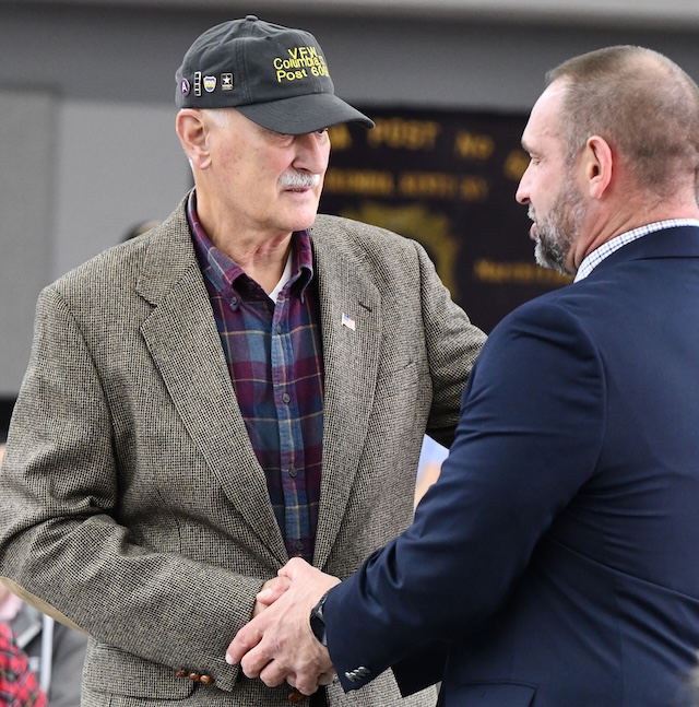 Lindsey Wilson University music professor Gerald Chafin directs the LWU Handbell Ensemble at the 23rd annual Lindsey Wilson Veterans Appreciation Luncheon, held Tuesday, November 11, 2025, at VFW Post 6097. Comments | Permalink Russell Lunsford greets Dean Schmidt