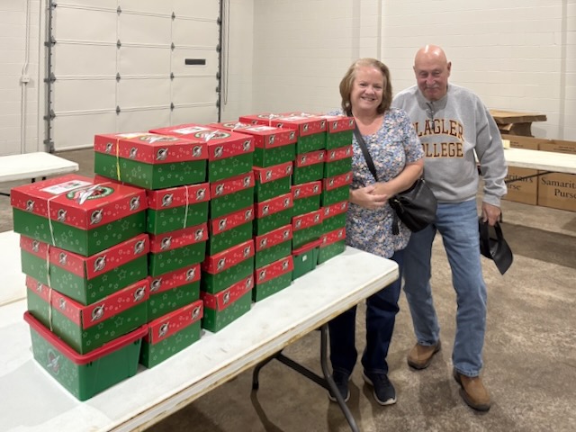 Antioch Church made the last drop off of shoebox gifts on day one. Pictured are JeanAnn and John Weis. They have been helping Antioch collect shoebox gifts for many many years.