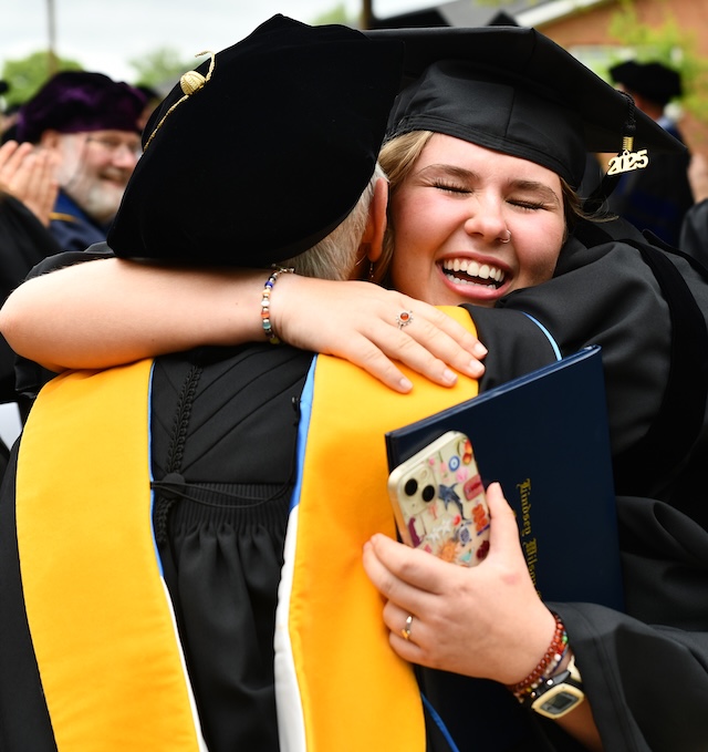 2026-01-01 - Columbia, KY - Photo courtesy Lindsey Wilson University. Lillian Clauson of Bonnieville, Kentucky, embraces her mother, biology professor Melissa Clauson, after earning a bachelor of arts degree in elementary education at Lindsey Wilson University's 121st commencement on May 3, 2025.