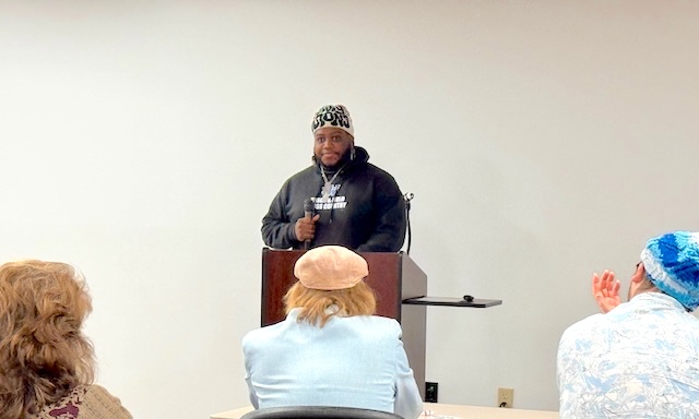 2026-04-09 - Columbia, KY - Photo by Linda Waggener, ColumbiaMagazine.com. LeeShawn Johnson, Lindsey Wilson University student, was among the writers who read their works recently. He shared a beautiful poem that we hope he can take time to send a copy we can post for readers. He had to exit the Adair County Arts Council Writers' Day event right after the applause to report to his coach.