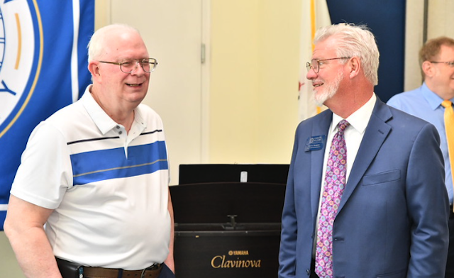 2026-04-09 - Columbia, KY - Photo from Lindsey Wilson University Athletics. 1976 Lindsey Wilson graduate Randy Kessler, at left, talks with Vice President for Development Kevin Thompson at the annual Golden Alumni Society luncheon in Columbia Thursday. Randy looked forward to connecting with two close friends from his class, Barry Frost and Doug Antle, while in town. The event is held each year celebrating the 50th class reunion.