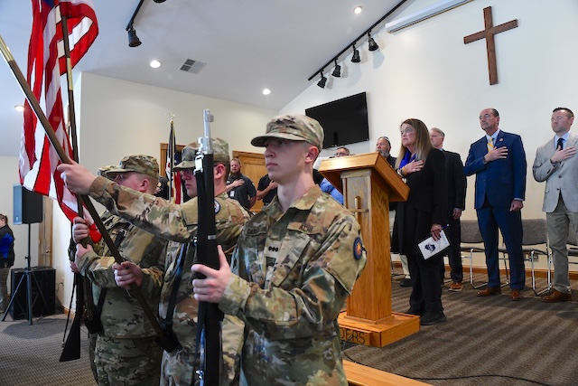2026-04-13 - Columbia, KY - Photo by Duane Bonifer. The second annual Spirit Of Columbia awards ceremony included the presentation of colors by the Adair County High School JROTC. They were accompanied by musicians in the Lindsey Wilson University band.