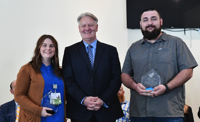 2026-04-14 - Columbia, KY - Photo by Duane Bonifer. Neil Thornbury, CEO T.J. Regional Health, center, spoke as he presented the Spirit of Columbia awards to these two servants. He said, "In June of 2025, Critical Care Paramedic Cody Neat and others arrived on the scene of a vehicle versus a combine accident near the Breeding community. A victim was trapped in his vehicle that had collided with a combine. Thinking outside the box, Cody Neat had the idea to contact T.J. Health Columbia to see if blood could be transported to the scene. Shelby Hatcher took the call, which was highly unusual, and she immediately escalated the situation to the Chief Medical Officer in the Emergency Department and to Hospital Administration and the Lab. Everyone agreed that this course of action was appropriate and Shelby personally delivered the blood to the scene with an escort from local law enforcement. The quick thinking by Cody, the efforts of Shelby, and the collaboration between all departments involved saved the victim's life."