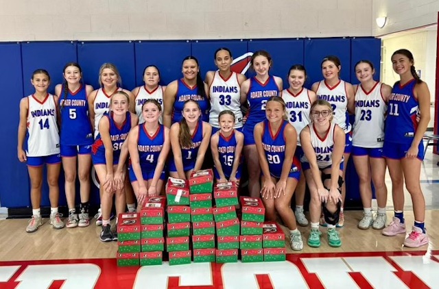 2024-11-23 - Columbia, KY - Photo from Mark Fudge. The ACHS FCA And Girls Basketball team combined forces to put the total number of shoebox gifts collected in Adair County over the 3,000 mark for the second year in a row. Lady Indians head coach Stacia Hill has been packing boxes for many years and this year the Lady Indians joined her in packing shoebox gifts.