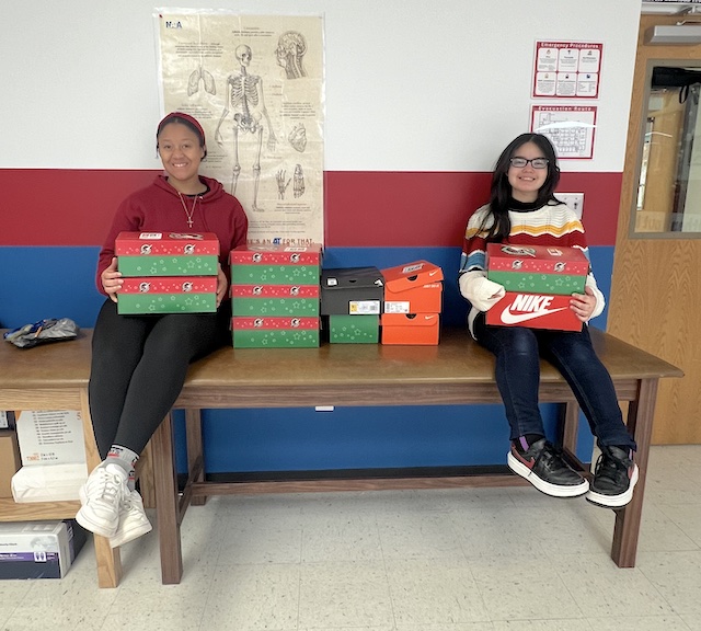 2024-11-23 - Columbia, KY - Photo from Mark Fudge. Alijah Baerg and Kate Familia add a finishing touch to the shoebox gifts collected by the ACHS Fellowship of Christian Athletes. The boxes prepared by the FCA and the Lady Indians basketball team gives Adair County or than 3,000 shoebox gifts with three days of collection remaining.