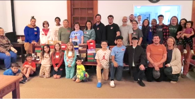 Members of the Sparksville Baptist Church enjoyed packing shoebox gifts this year. Pictured are, back row: Cindy Newman, Michaela Newman, Ellie Benson, Abigail McCosley, Naoma McCosley, Roseanna McCosley, Lindsey Harper, Mark Harper, Zach Morgan, Tim Morgan, Isaiah Morgan, Felicia Morgan, Ava Morgan, Grace Morrison, Dorinda Morrison, Caleb Morgan, Tasha Padgett, Leor Young, and Niya Young; front row: Nathan Young, Avi Young, Sophia Durbin, Evie Morgan, Shilah Durbin, Logan Young, Sawyer Padgett, Nathan McCosley, Jonah Morgan, Jeremy Durbin and Hanna Durbin.