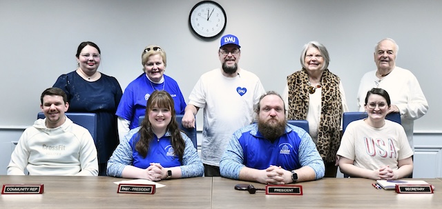 Front row, from left: Patrick Adkins '19, community representative; Alex Strein '15, past-president; Tanner Strein '13, president; and Kimberly Harden '22, secretary. Back row, from left: Director of Alumni Relations Allison Cross '09; Linda King '67, trustee; Gary Franklin '94; Jeannie Squires '72; and Ben Burr '64.