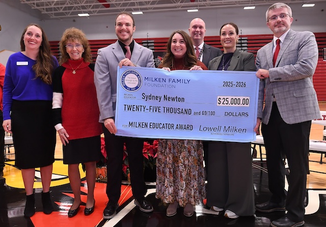 Milken Educator Award recipient Sydney Newton '16, center, holds a facsimile check representing the unrestricted $25,000 cash award that is presented to the award's recipients on Tuesday, December 16, 2025, in Taylor County High School's Citizens Bank Arena.