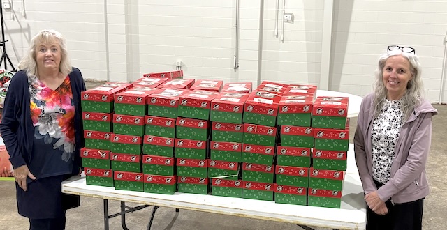 Linda Jennings and Ashley Reeder dropped by the Wheet Fellowship Hall at the Columbia First Church of the Nazarene on Wednesday night and dropped off shoebox gifts from the Sparksville Nazarene Church.