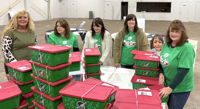 Several of the adult leaders at the Cane Valley Baptist Church along with many of the church youth put the finishing touches on the 525 shoebox gifts that were packed by the Cane Valley Baptist Church this year.