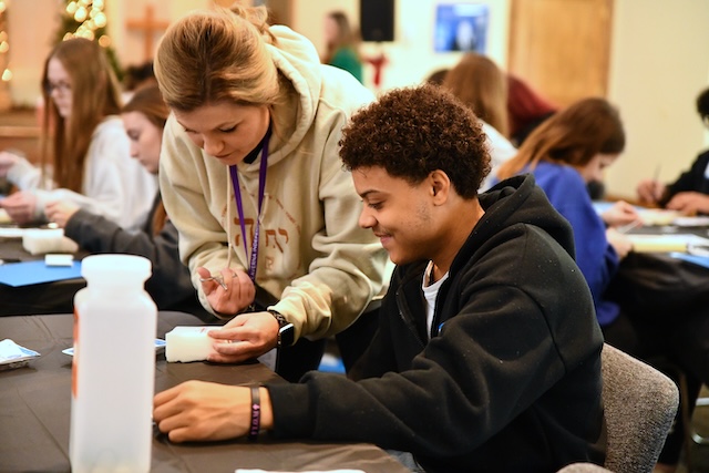 2025-11-28 - Columbia, KY - Photo courtesy Lindsey Wilson University. Julio Alonso of Caverna High School gets assistance with a suture exercise during Lindsey Wilson University's nursing preview day on Friday, November 21, 2025, in the Norma and Glen Hodge Center for Discipleship. More than 150 area high school students attended the event.