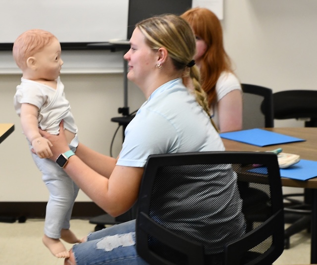 2025-11-28 - Columbia, KY - Photo courtesy Lindsey Wilson University. Madison Rigney of Cumberland County High School holds a mannequin baby during Lindsey Wilson University's nursing preview day on Friday, November 21, 2025, in the pediatric laboratory of the Dr. Robert and Carol Goodin Nursing and Counseling Center. More than 150 area high school students attended the event.