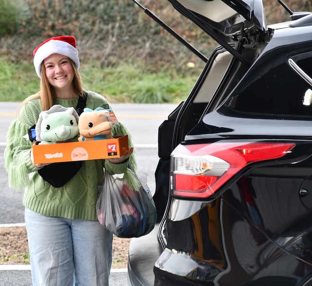 2025-12-10 - Columbia, KY - Photo courtesy Lindsey Wilson University. Lindsey Wilson University student Jay Woodall '27 of Somerset, Kentucky, delivers an armful of toys to Adair County Head Start on Wednesday, December 10, 2025. The Lindsey Wilson Bonner Scholar Program's "Coats for Kids" donated 48 winter coats -- along with winter hats and gloves, toys and games -- to Head Start.
