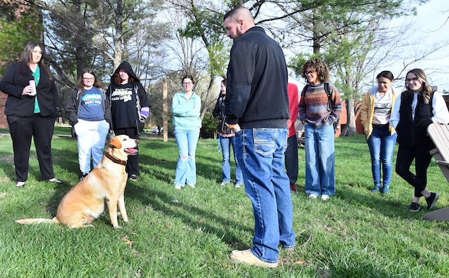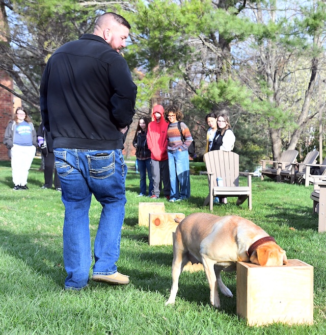 2026-03-20 - Columbia, KY - Photo courtesy Lindsey Wilson University. Columbia Police Department K9 unit, Cally, reaches for her reward -- a fluorescent orange tennis ball -- thrown by Sgt. Trevor Foster. Foster demonstrated Cally's work to Lindsey Wilson University students in counseling professor Mahalia Cain's "Substance Abuse" class on Thursday, March 19, 2026.