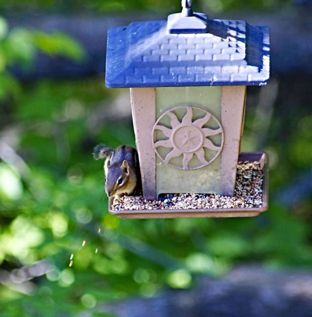 Roldcat writes, "I was wondering why I was going through so much bird feed. I am filling the feeder more often than usual lately. This morning I was able to get my answer. I caught the culprit climbing the Shepard's hook that holds my bird feeders. Photo one catches the chipmunk in flight jumping from the Shepard's hook onto the feeder. Photo two shows him sitting in the feeder digging for sunflower seeds. He has made several trips to the feeder so far this morning."