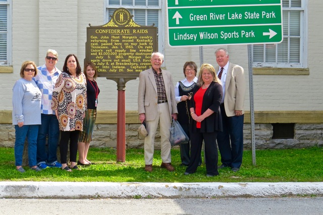 Adair County Historical Association (AHA) members Jane Grant, President Ellen Zornes; Deputy CJE Andrea Waggener; Ed Vincent, member AHA, Columbia-Rotary Club, Columbia Christian Church Band of Brothers, and resident of Greensburg, KY; Linda Waggener; Chamber President Pam Hoots, and Mr. Richard Phelps, took part in the unveiling of the Historical Marker meticulously restored by Ed Vincent, who also provided elan and sparkling apple cider for the unveiling event after the marker was restored. Photo 2 May 2018, just after 10amCT. A good time was had by all. - EW