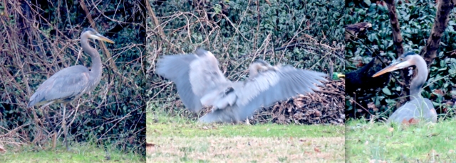 A Great Blue Heron swept to the little Town Creek that flows through the yard in Columbia, landed and marched to the pool that forms around the root formations under the ancient Catalpa tree. He posed, quiet and still for a moment, as he scanned the pool. Then he began a slow walk up the creek toward John and Missy Arnold's fence, gazing all around as he stepped ever so lightly through the water.