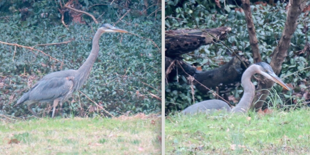 A Heron has an interesting walk. When he straightens up to his three-to-five feet height, his neck makes a lovely S form. As he takes a step, his neck stretches out long. As he spots food, his head would snap downward to the little creek, and then he would rise again.