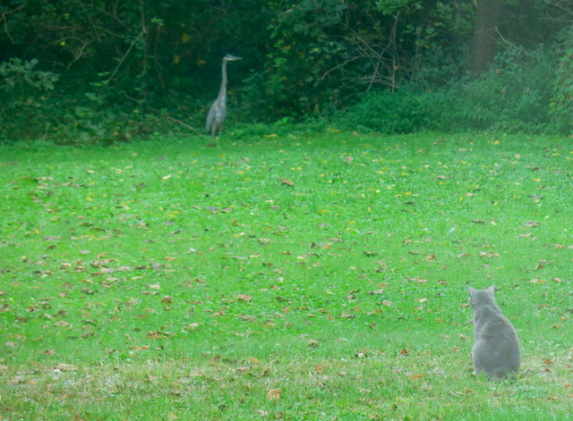 Slowly Blue the Cat begins to creep into the picture - in full bird hunting mode - which slowed and then halted when he got close enough to realize the size of the Heron. For a moment they stared at each other, taking each other's measure.