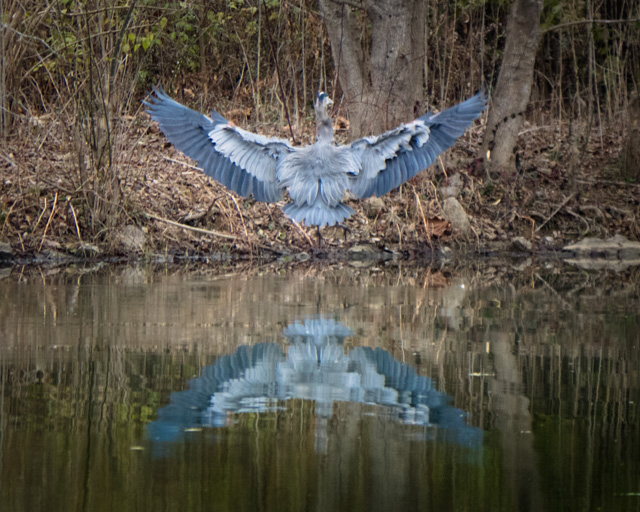 A great blue touches down on the shore of Lake Shelby.