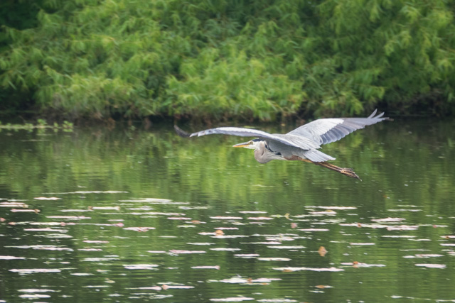 A great blue, gliding across the pond in the Grand Allee at Beckley Creek Park in eastern Jefferson Co., KY.