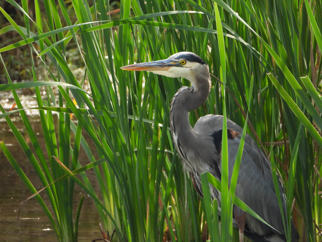 A great blue heron, tucked into the cattails in a local pond.