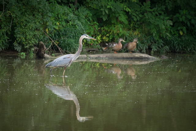 A great blue, fishing with the ducks on a hot July afternoon.