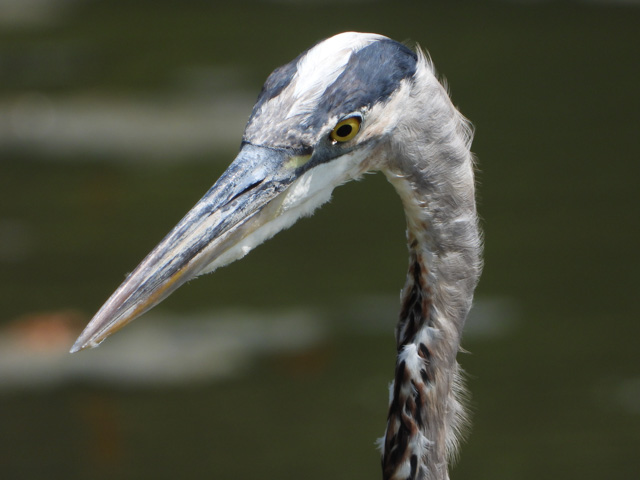 A closeup view of a Great Blue Heron. According to audubon.org, the Great Blue's diet is "Highly variable and adaptable. Eats mostly fish, but also frogs, salamanders, turtles, snakes, insects, rodents, birds. Has been seen stalking voles and gophers in fields, capturing rails at edge of marsh, eating many species of small waterbirds."