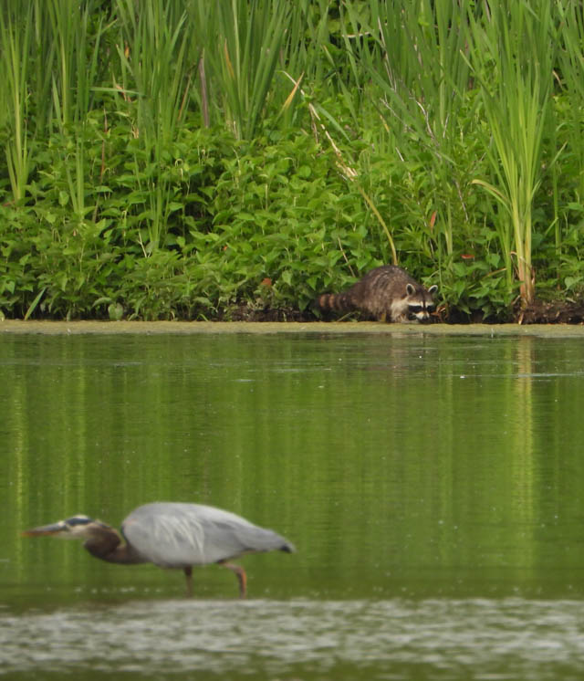 I was watching a Great Blue Heron, who looked poised to strike at a dinner-time fish, when I saw this raccoon amble out of the cattails in the background to wash his paws.